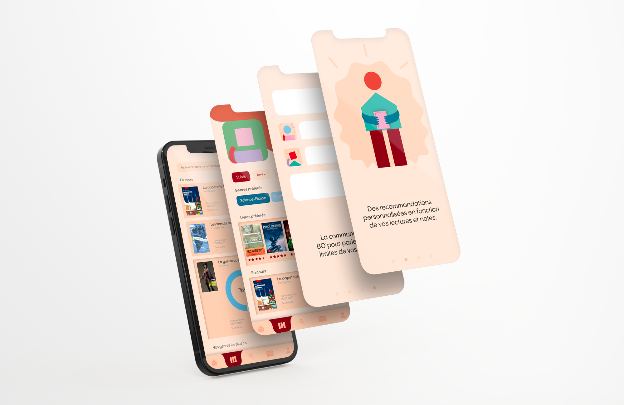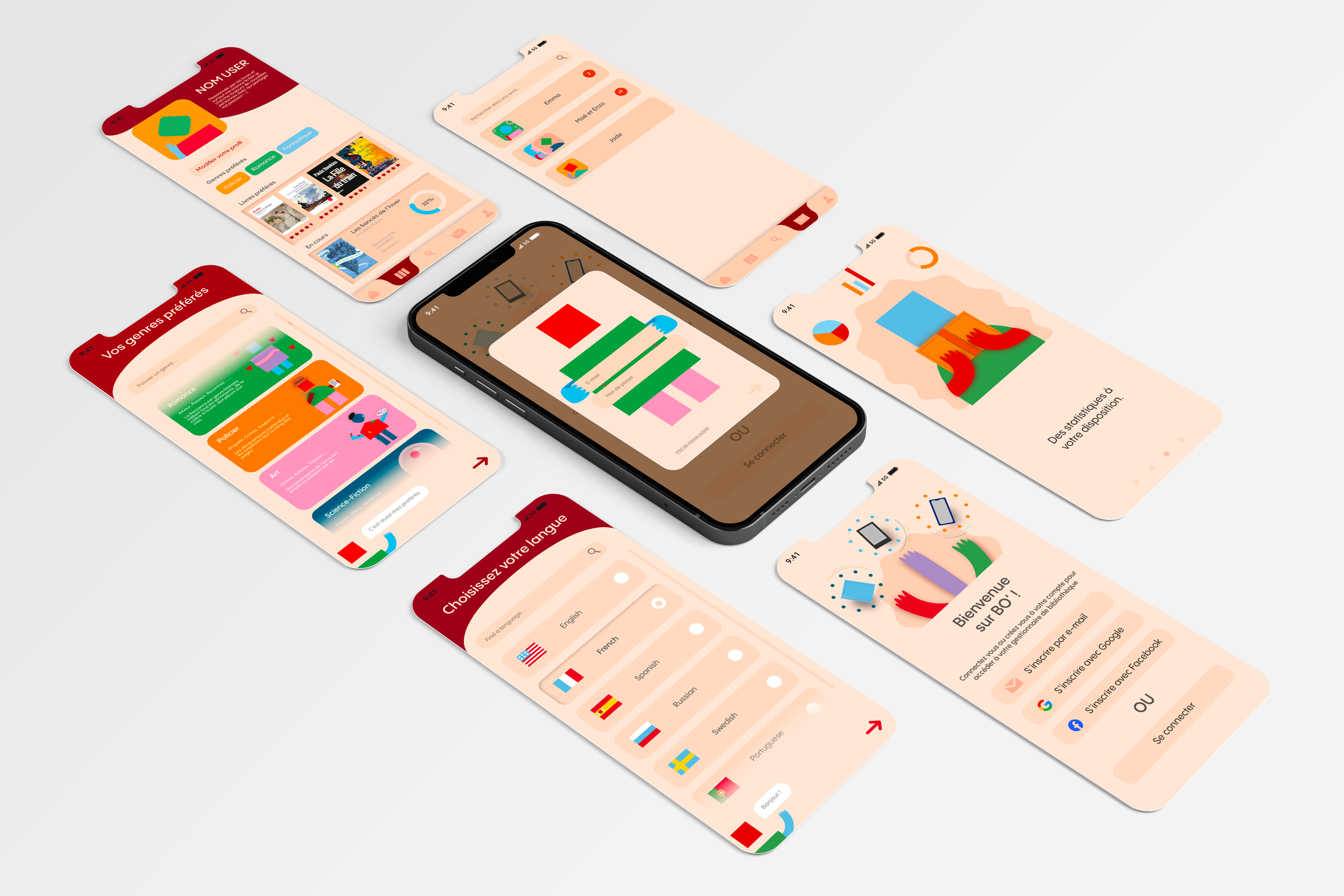 Travail personnel sur la conception de l'interface mobile d'une application de lecture pour travailler la colorimétrie, l'illustraton, l'UX et apprendre à utiliser Figma.